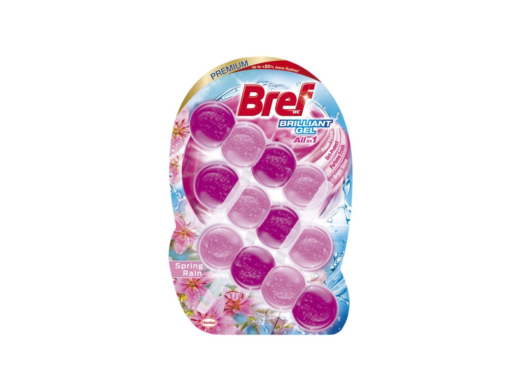 novace od značky Bref! Naše skvělé řešení pro vaši toaletu. Bref Brilliant Gel se svým All in 1 složením se 4 funkcemi nejen čistí toaletu s každým spláchnutím a zabraňuje usazování nečistot, ale také poskytuje svěžest a zářivý lesk. Až o 20 % více spláchnutí ve srovnání s Bref Power Aktiv.